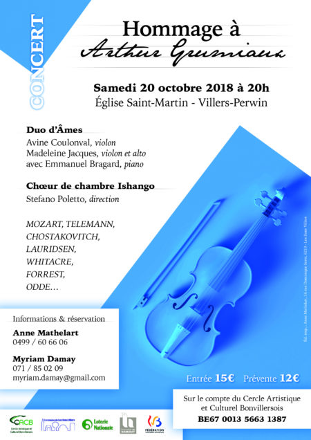 Le duo d’Âmes et le Chœur de Chambre Ishango sont les invités du 9èmeconcert en hommage à Arthur Grumiaux, organisé par le Cercle Artistique et Culturel Bonvillersois, le samedi 20 octobre à 20h, dans l’église Saint-Martin de Villers-Perwin.